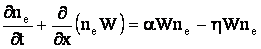 где ne–плотность электронов, t– время, x– расстояние от катода. измеряемое в направлении приложенного однородного электрического поля, W– скорость дрейфа электронов, а