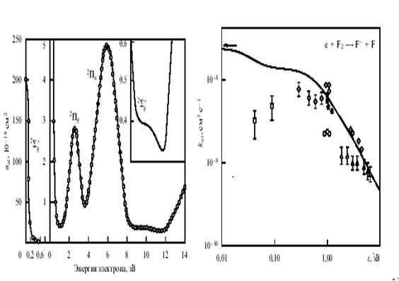 Отметим большой разброс данных. Сечение прилипания электрона к молекуле хлора как функция энергии электрона представлено на рис.14,а. Наблюдаемый резонанс при малых энергиях электрона свидетельствует о пересечении терма автораспадного состояния Сl-2 (2Σ+u) и молекулярного терма, что противоречит данным табл.1. Зависимость от энергии для константы скорости прилипания электрона к молекуле фтора приведена на рис.14,б).