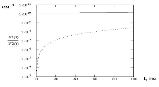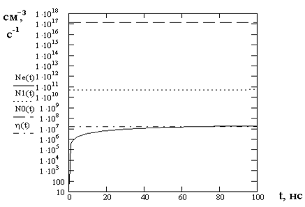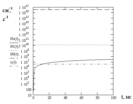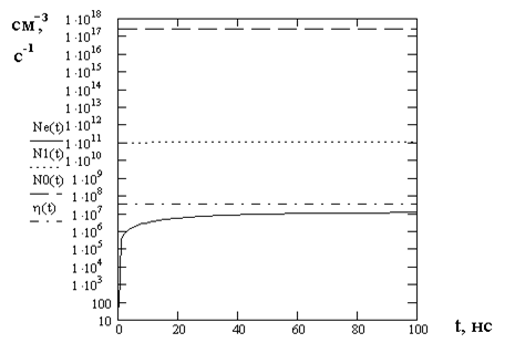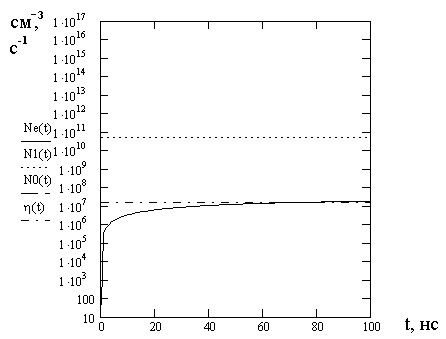Результаты численных расчетов показывают, что концентрация электронов примерно через 100 нс выходит на стационарный уровень (I/η), причем частота прилипания определяется только концентрацией молекул HCl в основном колебательном состоянии. Для получения концентрации электронов предыонизации ~ 108 см-3 необходимо обеспесчить производительность источника предыонизации ~ 14.4∙1014 (см3∙с)-1 при концентрации молекул HCl ~ 3.3∙1016 см-3. На рис.18 представлены зависимость концентрации электронов достигаемой за 100 нс от парциального давления HCl и производительности источника предыонизации.