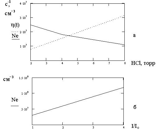 Парциальное давление HCl: 1торр(а); 2 торр(б). Производительность источника предыонизации I=3.6∙1014 (см∙с)-1.