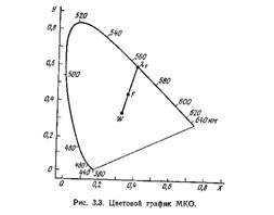 Упрощенная цветовая характеристика объекта возможна и в двухмерной форме — точкой на цветовом графике МКО (рис. 3.3). Значение цветовых индексов источника (координат х и у) позволяет найти две его важнейшие характеристики: цветовую тональность, определяемую доминирующей длиной волн излучения (λf для источника F на рис. 3.3); цветовую иасыщенность, определяемую чистотой света (выраженное в процентах отношение отрезков W-F, λf на рис. 3.3).