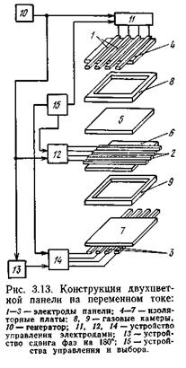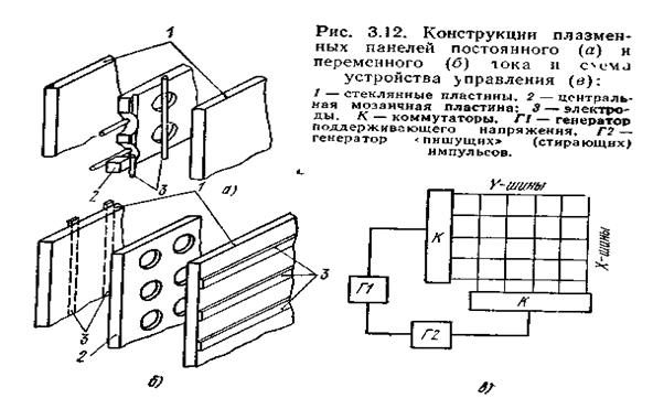 В конструкциях рис. 3.12 центральная мозаичная пластина служит для изоляции разрядных промежутков друг от друга, ею определяется разрешающая способность экрана, близкая к 10 . 20 лин/см. Ограничения области разряда можно добиться и без перегородок повышением давления газовой смеси, которое ведет к стягиванию плазменного шнура, возникающего в месте пересечения возбужденных X- и У-электродов. Идя по этому пути, можно существенно повысить разрешающую способность,