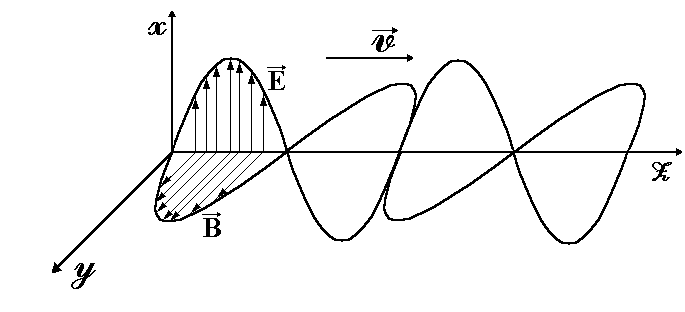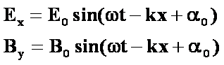 в электромагнитной волне в простейшем случае меняются по гармоническому закону. Уравнениями плоской электромагнитной волны, распространяющейся в направлении Z, являются: