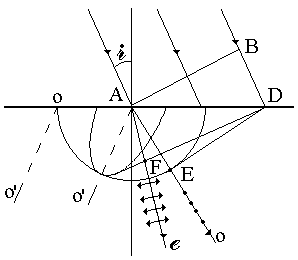 1. В кристалле происходит двойное лучепреломление. Построения Гюйгенса позволяет определить направления распространения обыкновенного и необыкновенного лучей.