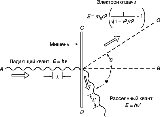 Согласно теории Планка и Эйнштейна, энергия света с частотой ν передается порциями – квантами (или фотонами), энергия которых Е равна постоянной Планка h, умноженной на ν. Комптон же предположил, что фотон несет импульс, который (как следует из теории Максвелла) равен энергии Е, деленной на скорость света с. При столкновении с электроном мишени рентгеновский квант передает ему часть своей энергии и импульса. В результате рассеянный квант вылетает из мишени с меньшими энергией и импульсом, а следовательно, с более низкой частотой (т.е. с большей длиной волны). Комптон указал, что каждому рассеянному кванту должен отвечать выбиваемый первичным фотоном быстрый электрон отдачи, что и наблюдается экспериментально.