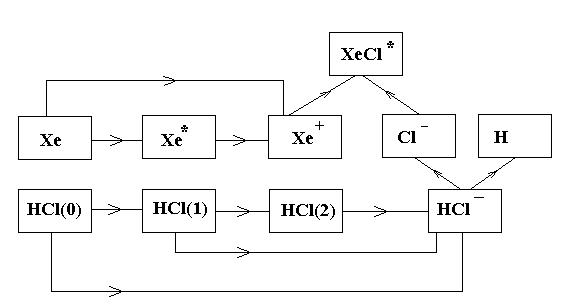 Для теоретического исследования кинетики образования эксимерных XeCl* молекул нами была использована упрощенная модель, блок-схема которой представлена на рис.2.