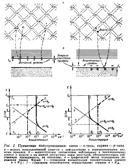 Положение уровня Ферми в электронном и дырочном полупроводниках можно найти не только путем аналитического решения сложного уравнения, но и графическим способом. Предварительно необходимо заметить, что в электронном полупроводнике, кроме донорных примесей, могут находиться и акцепторные. Но что бы электропроводность была обусловлена в основном носителями одного знака, концентрация донорных примесей должна значительно превосходить концентрацию акцепторных. Такое положение часто возникает при недостаточной очистке (из-за ее трудности или нерентабельности технологии) исходного материала от имеющихся в нем примесей и последующим введением требуемых примесей. Аналогичное замечание может быть сделано и о наличии донорных примесей в дырочном полупроводнике. Так, до сих пор еще не получен чистый (собственный) кремний, потому что он содержит трудно удаляемую примесь бора, являющуюся для кремния акцептором. Для получения кремния с электронной проводимостью в него надо ввести донорные примеси в таком количестве, чтобы они значительно превысили естественную концентрацию акцептора (бора) в исходном материале. В случае равенства концентраций доноров и акцепторов поупроводник называют «скомпенсированным».