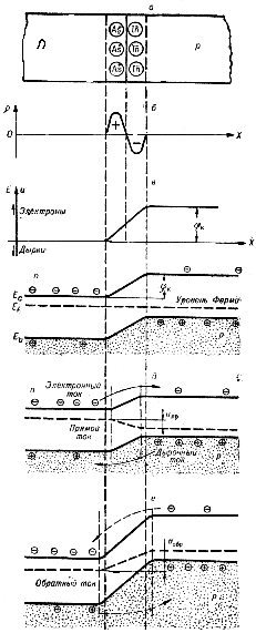Как было показано выше, материал n-типа имеет подвижные электроны и равное число фиксированных положительных ионов донорной примеси, а материал p-типа содержит подвижные положительные заряды-дырки и неподвижные отрицательные заряды в виде ионизированных атомов акцепторов. При контакте этих двух материалов с разным типом проводимости электроны из n-области будут переходить в p-область, а дырки — из p-области — в n-область вследствие разности их концентраций в этих областях. Уход электронов из приконтактной области электронного материала и дырок из приконтактной области дырочного материала приведет к обеднению этих участков подвижными носителями и появлению нескомпенсированного положительного заряда от ионизированных атомов доноров в приконтактной области л-типа материала и отрицательного заряда от ионизированных атомов акцепторов в приконтактной области материала p-типа. В результате в месте контакта образуется двойной электрический слой (рис. 3,6). Это приведет к возникновению разности потенциалов в приконтактном слое такого направления (рис. 3,в), что она будет препятствовать дальнейшему переходу подвижных зарядов из одной области материала в другую, т. е. электронов из л-типа материала в материал p-типа и дырок из p-материала в л-материал, так что в состоянии равновесия ток через p-n-переход будет равен нулю. Так как приконтактный слой обеднен подвижными носителями,то он будет обладать повышенным электрическим сопротивлением, вследствие чего получил название запирающего слоя p-n-перехода.