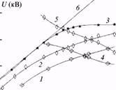 На рис.1 представлены зависимости разрядного напряжения С/2 (кривые 1, 2) и амплитуды напряжения С/1 (кривая 3) на выходе генераторов импульсного напряжения от С/о. Прямая 6 показывает величину 4 С/о, которая соответствует максимально возможным значениям C/i и С/2. Кривыми 4 и 5 обозначены зависимости коэффициента k передачи запасенной в генераторах импульсного напряжения энергии в импульсно заряжаемую емкость С. На рис.1 видно, что с ростом С/о амплитуда генератора U сохраняет максимально возможное значение 4С/о вплоть до С/о ~ 23.5 кВ. Однако при этом амплитуды С/2 напряжения на разряде существенно отличаются от максимально возможного значения 4С/о (кривые 1, 2). Для d = 8 см это обуславливает достаточно малый коэффициент передачи энергии k = 0.56 (кривая 4), которому соответствует энергия генерации Е = 5.3 Дж и КПД ц = 1.3% (рис.4, кривые 2). Увеличение d до 9 см приводит к возрастанию амплитуды разрядного напряжения (кривые 1, 2) и повышению коэффициента передачи энергии до k = 0.7 (кривая 5), что влечет за собой рост энергии генерации до 7.5 Дж и КПД до 1.65% (рис.4, кривые 3).