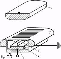 1 — высоковольтный электрод; 2—заземленный щелевой электрод; 3 — ножевой электрод; 4 — сапфировая пластина; 5 — охлаждаемая металлическая подложка.