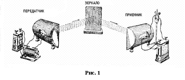 В школьных учебниках физики вы можете найти описание опыта, который произвел в 1888 г. знаменитый физик Герц (рис. 1). Своим опытом ученый доказал, что полученные им радиоволны, которые он назвал электромагнитными, могут отражаться от металлических тел, подобно тому, как лучи света отражаются от зеркал. На рисунке вы видите три основные детали. Слева расположен прибор, излучающий радиоволны, направленные пучком к большому металлическому листу. Эта вторая деталь рисунка представляет собой зеркало для радиоволн. Отразившись от металлического листа, радиоволны попадают к приемному аппарату.