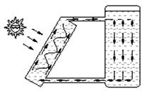 Водонагреватель. Водонагреватель предназначен для снабжения горячей водой, в основном, индивидуальных хозяйств. Устройство состоит из короба со змеевиком, бака холодной воды, бака-аккумулятора и труб. Короб стационарно устанавливается под углом 30-50° с ориентацией на южную сторону. Холодная, более тяжелая, вода постоянно поступает в нижнюю часть короба, там она нагревается и, вытесненная холодной водой, поступает в бак-аккумулятор. Она может быть использована для отопления, для душа либо для других бытовых нужд.