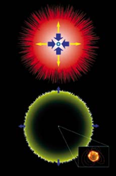 Вспышка сверхновой звезды — это просто переход части гравитационной энергии в тепловую. Когда в старой звезде заканчивается топливо и термоядерная реакция уже не может разогреть ее недра до нужной температуры, происходит как бы обрушение — коллапс газового облака на его центр тяжести. Высвобождающаяся при этом энергия разбрасывает внешние слои звезды во все стороны, образуя расширяющуюся туманность. Если звезда маленькая, типа нашего Солнца, то происходит вспышка и образуется белый карлик. Если масса светила более чем в 10 раз превышает Солнечную, то такое обрушение приводит к вспышке сверхновой звезды и образуется обычная нейтронная звезда. Если же сверхновая вспыхивает на месте совсем большой звезды, с массой 20—40 Солнечных, и образуется нейтронная звезда с массой большей трех Солнц, то процесс гравитационного сжатия приобретает необратимый характер и образуется черная дыра.
