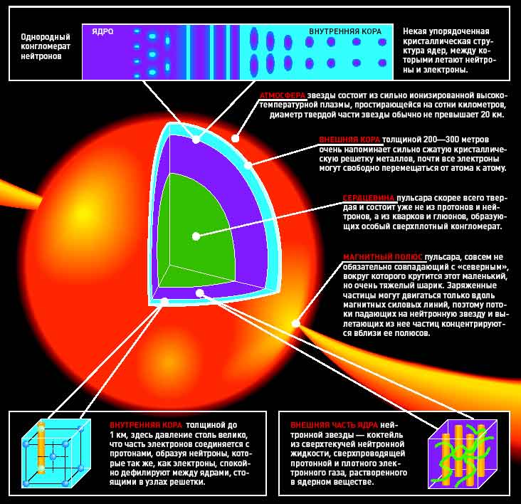 Твердая корка внешних слоев нейтронной звезды состоит из тяжелых атомных ядер, упорядоченных в кубическую решетку, с электронами, свободно летающими между ними, чем напоминает земные металлы, но только намного более плотные.