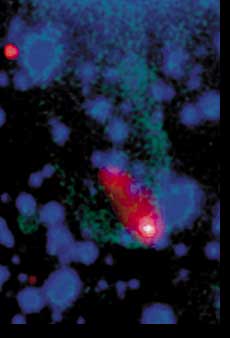 Взрыв сверхновой звезды достаточно часто сообщает новорожденному пульсару немалую скорость. Такая летящая звезда с приличным собственным магнитным полем сильно возмущает ионизированный газ, заполняющий межзвездное пространство. Образуется своеобразная ударная волна, бегущая впереди звезды и расходящаяся широким конусом после нее. Совмещенное оптическое (сине-зеленая часть) и рентгеновское (оттенки красного) изображение показывает, что здесь мы имеем дело не просто со светящимся газовым облаком, а с огромным потоком элементарных частиц, испускаемых данным миллисекундным пульсаром. Линейная скорость Черной Вдовы равна 1 млн. км/ч, оборот вокруг оси она делает за 1,6 мс, лет ей уже около миллиарда, и у нее есть звезда-компаньон, кружащаяся около Вдовы с периодом 9,2 часа. Свое название пульсар B1957+20 получил по той простой причине, что его мощнейшее излучение просто сжигает соседа, заставляя «кипеть» и испаряться образующий его газ. Красный сигарообразный кокон позади пульсара — это та часть пространства, где испускаемые нейтронной звездой электроны и протоны излучают мягкие гамма-кванты.