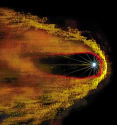 Результат компьютерного моделирования позволяет очень наглядно, в разрезе, представить процессы, происходящие вблизи быстро летящего пульсара. Расходящиеся от яркой точки лучи — это условное изображение того потока лучистой энергии, а также потока частиц и античастиц, который исходит от нейтронной звезды. Красная обводка на границе черного пространства вокруг нейтронной звезды и рыжих светящихся клубов плазмы — это то место, где поток релятивистских, летящих почти со скоростью света, частиц встречается с уплотненным ударной волной межзвездным газом. Резко тормозя, частицы испускают рентгеновское излучение и, потеряв основную энергию, уже не так сильно разогревают налетающий газ.