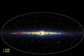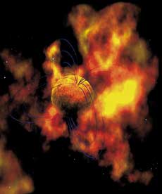 Магнитное поле вращающегося электропроводящего шара бывает неустойчивым, и резкая перестройка его структуры может сопровождаться выбросом колоссальных количеств энергии (наглядный пример такой неустойчивости — периодическая переброска магнитных полюсов Земли). Аналогичные вещи случаются и на Солнце, во взрывных событиях, названных «солнечными вспышками». В магнетаре доступная магнитная энергия огромна, и этой энергии вполне достаточно для мощи таких гигантских вспышек, как 5 марта 1979 и 27 августа 1998 годов. Подобные события неизбежно вызывают глубокую ломку и изменения в структуре не только электрических токов в объеме нейтронной звезды, но и ее твердой коры. Другим загадочным типом объектов, которые испускают мощное рентгеновское излучение во время периодических взрывов, являются так называемые аномальные рентгеновские пульсары — AXP. Они отличаются от обычных рентгеновских пульсаров тем, что излучают только в рентгеновском диапазоне. Ученые полагают, что SGR и AXP являются фазами жизни одного и того же класса объектов, а именно магнетаров, или нейтронных звезд, которые излучают мягкие гамма-кванты, черпая энергию из магнитного поля. И хотя магнетары на сегодня остаются детищами теоретиков и нет достаточных данных, подтверждающих их существование, астрономы упорно ищут нужные доказательства.