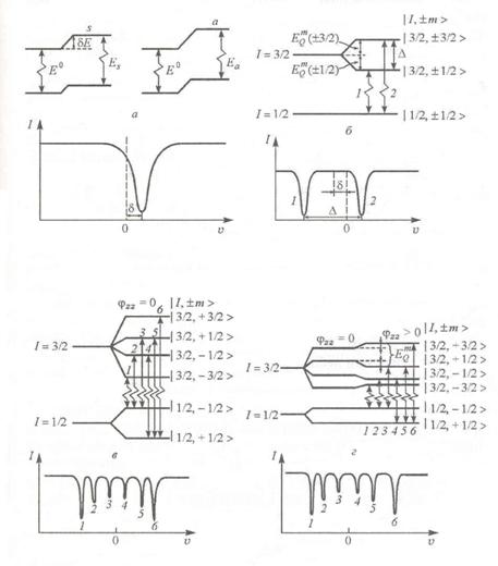 Fe и вид мессбауэровских спектров на пропускание при изомерном (химическом) сдвиге (a), квадрупольном взаимодействии (б), магнитном и дипольном взаимодействии (в) и комбинированном взаимодействии (магнитное дипольное плюс относительно слабое квадрупольное взаимодействие) (г).
