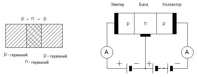 тока (запирающий слой). Наличие трёх полупроводников в плоскостном триоде приводит к образованию двух запорных слоёв по обе стороны среднего полупроводника. Таки образом, полупроводниковый триод в отличие от диодов содержит два электронно-дырочных перехода. Он как бы представляет собой два диода, соединённых последовательно, навстречу друг другу.