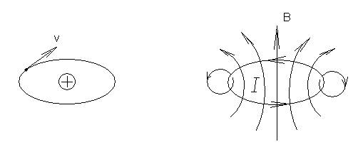 На рисунке 45,а изображён простейший атом, состоящий из ядра и обращающегося вокруг него электрона. Электрический ток, эквивалентный движению электрона (рис 45,б).