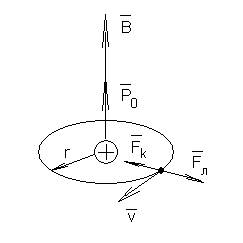 Рассмотрим случай, когда плоскость орбиты электрона перпендикулярна к вектору В0 магнитного поля (рис46). На электрон в этом случае, кроме кулоновской силы Fк, действует сила Лоренца Fл, равная evB0. Равнодействующая сила при этом равна либо сумме, либо разности Fк и Fл, поэтому и центростремительное ускорение в этих двух случаях различно. Оно или увеличится или уменьшится, соответственно изменяется и частота обращения электрона вокруг ядра. Это изменение частоты и обусловливает появления дополнительного магнитного момента, так как изменяется сила эквивалентного тока.