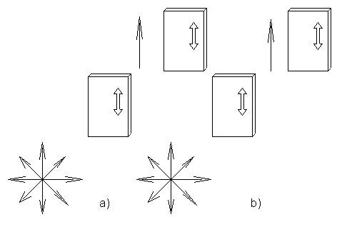 Поместим теперь между двумя скрещёнными поляризаторами два стекла, а между ними - нематическую жидкость, предварительно слегка пополировав стекла вдоль определённого направления. Такая полировка стёкол нужна для того, чтобы сориентировать в заданном направлении оптическую ось жидкого кристалла (n). Например, при параллельной полировке стёкол молекулы, прилипшие к стёклам параллельно микробороздам на стеклянной поверхности, задают благодаря описанным межмолекулярным взаимодействиям такую же ориентацию вектора n и в глубине слоя нематической жидкости (рис61а). Если неполированные стёкла предварительно обработать специальными химическими веществами, то можно добиться ориентации оси n перпендикулярно стеклянной поверхности (рис61б).