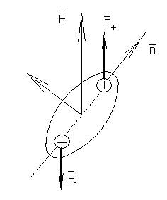 Пусть молекула, у которой диполь легко образуется вдоль длинной оси, находится в электрическом поле и между векторами Е и n имеется некоторый угол. Тогда в образовавшемся диполе на заряды +Q и –Q действуют силы F+ =+QE и F- = -QE; таким образом, возникает пара сил, создающая крутящий момент.