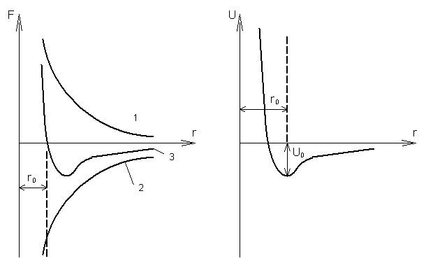 Рассмотрим взаимодействие двух частиц. На большом расстоянии частицы практически не взаимодействуют между собой. При сближении атомов появляются как силы притяжения между ними, так и силы отталкивания. Силы притяжения и силы отталкивания по-разному зависят от расстояния r между частицами. При уменьшении расстояния между частицами силы отталкивания возрастают быстрее, чем силы притяжения. На рисунке 16 линиями 1 и 2 изображена зависимость этих сил от расстояния между этими частицами. Силы притяжения действуют между разноимёнными зарядами и потому являются отрицательными, силы отталкивания действуют между одноимёнными зарядами и являются положительными. Линия 3 изображает зависимость результирующей этих сил от расстояния между частицами. результирующая сила взаимодействия вначале проявляет себя как сила притяжения. На расстоянии r0, равном приблизительно сумме радиусов молекул, сила отталкивания равна силе притяжения, и результирующая сила становится равной нулю. При дальнейшем сближении молекул результирующая сила является силой отталкивания и возрастает с уменьшением расстояния очень быстро.