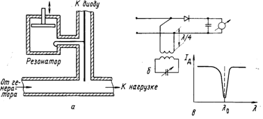 В некоторых случаях полезна вторая схема включения резонансного частотомера – с индикацией по минимуму тока при резонансе. Устройство такого резонатора изображено на (рис. 3а) эквивалентная схема – на (рис. 3б). На частотах отличной от резонансной входное сопротивление параллельно включенного контура мало и, будучи трансформированным в цепь детектора через отрезок длинной λ/4, не вносит заметных изменений в основную цепь. В следствии этого через индикаторный прибор проходит значительный ток. При настройке контура на частоту колебаний внешнего СВЧ-источника его входное сопротивление резко возрастает, цепь детектора оказывается шунтированной малым сопротивлением и ток через прибор значительно уменьшается (рис. 3в). Скорость изменения показаний прибора при изменении настройки вблизи резонанса зависит как от собственной добротности резонатора, так и от коэффициента связи резонатора с линией. При измерении частоты непрерывных колебаний стремятся обеспечить максимально возможную собственную добротность резонатора. Большую добротность имеют резонаторы с большими размерами. Однако размеры их не должны быть чрезмерными, иначе появляются нежелательные колебания высших видов, затрудняющие выделение рабочего вида колебаний. Подавить паразитные колебания можно выбором соответствующей конструкции и определенного расположения элементов связи, а также применением щелей или других элементов с сильным затуханием для волн нежелательных видов.