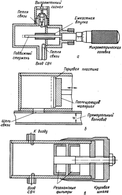 На (рис. 7) показаны устройства резонаторов с элементами связи и настройки, наиболее часто применяемые в резонансных частотомерах. На (рис. 7а) приведена конструкция резонатора в виде четвертьволнового отрезка коаксиальной линии. Связь резонатора с ВЧ-генератором и измерительным прибором осуществляется посредством петель, расположенных в боковой стенке. Резонатор настраивается при изменении длины центрального проводника. Шкала микрометра, связанного с центральным проводником, градуируется в длинах волн или снабжается градуировочной кривой. ВЧ-контакт между внутренним проводником и торцевой стенкой резонатора образуется при помощи емкости. Противоположный конец резонатора закрыт металлической крышкой. Из-за емкостного краевого эффекта у свободного конца центрального проводника резонансная длина получается несколько меньше λ/4.
