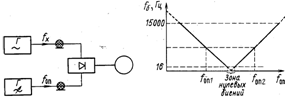 На линейный элемент-смеситель (рис. 8) подаются ВЧ-сигнал с неизвестной частотой fx и сигнал с частотой fоп от опорного источника. На выходе смесителя получаются сигналы с этими же частотами, а также их гармоники и сигналы с частотами биений. Так как амплитуды гармонических составляющих невелики, а следовательно, невелики и сигналы их разностной частоты, то для индикации удобно использовать сигнал с частотой биений fб=fх–fоп=0. Отсюда и название метода-метод нулевых биений. На выходе нелинейного элемента включается индикатор, например телефон, пропускающий только сигналы звуковой частоты. Если плавно изменять частоту опорного генератора, то при fх-fоп<15000 Гц в телефоне появляется тон разностной частоты, который понижается три сближении fх и fоп.