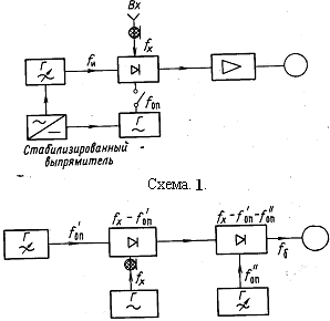 Когда разность частот fх-fоп больше предельной частоты измерителя звуковой частоты, можно применять двойное гетеродинирование, используя схему 2. Измерения по такой схеме более точны, поскольку проще создать измеритель частоты с высокой стабильностью и повышенной точностью измерений, используя интерполяционный генератор с небольшим диапазоном перестройки частоты.