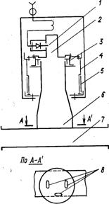 Поляризационный измеритель полных сопротивлений состоит из отрезков прямоугольного 7 и цилиндрического 6 волноводов, причем цилиндрический волновод расположен под прямым углом к широкой стенке прямоугольного волновода (рис. 11). Связь между волноводами осуществляется через три щели 8 одинаковых размеров, расположенные на равном расстоянии от центра цилиндрического волновода.