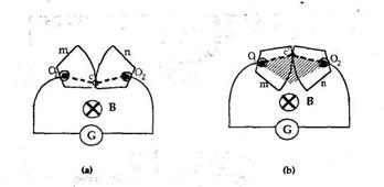 Рис. 10. Пример Феинмана, в котором есть несоответствие между разрядом изменения в магнитном потоке через петлю кругооборота и вызванную эдс, созданную в этом. Заштрихованная область в (b) представляет относительно большое изменение в области, содержащей магнитный поток по сравнению с (a).
