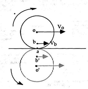 Рис. 11. Два колеса, катящиеся на верху друг друга, демонстрируя несоответствие между скоростями физических точек в колесах и их объединенной точке контакта. В установке Феинмана, скорость Vo трогательного точки (чтобы не быть перепутаной с физическими точками в контакте, которые являются мгновенно постоянными), определяет область, унесенную вдаль текущей дорожкой. Физические точки b, b' двигаются медленнее. Их скорости, Vb определяют силу Лоренца на электронах и следовательно, вызванной эдс. Закон Ленза сохранен, потому что скорости Vo и Vh находятся в том же самом направлении.