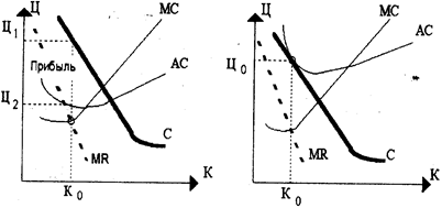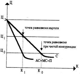 Если предположить, что данные предприятия договорились о сотрудничестве, то общее руководство будет рассуждать как монополист. В связи с тем, что максимальная прибыль монополиста достигается при таком выпуске, когда предельные издержки равны предельному доходу, объем выпуска олигополии вероятнее всего сократится до К1 и цена будет повышена до Ц1. Для каждого предприятия будут установлены квоты реализации, в сумме составляющие К1, что естественно меньше первоначального объема К0. Таким образом, даже относительно небольшие предприятия могут пользоваться преимуществами чистой монополии. Принято считать, что если в условиях олигополии предприятия получают прибыль, превышающие альтернативную стоимость, они ведут себя как чистая монополия, в противном случае, как предприятия, работающие на рынке монополистической конкуренции.