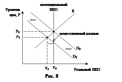 Теперь, допустим, что монетарная политика действует наоборот, то есть она сдвигает кривую совокупного спроса влево-вниз (рис. 8) и создаёт рецессионный разрыв. Если фискальные органы захотят восстановить реальный ВВП до его естественного уровня, они должны сдвинуть кривую совокупного спроса обратно до её начального положения, D0. Чтобы сделать это, они также должны увеличить расходы, либо понизить налоги, увеличивая бюджетный дефицит. Таким образом, сдерживающая монетарная политика изменяет соответствующую фискальную политику от сбалансированного бюджета к бюджетному дефициту.