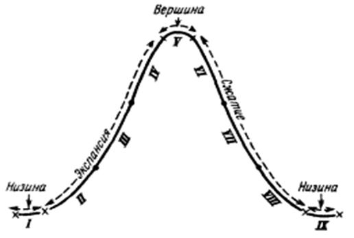 Условно устанавливается, что каждая низина и каждая вершина охватывают собой период, равный трем месяцам. Фаза "экспансия" подразделяется во времени на три в максимально возможной степени равные части; подобным же образом расчленяется фаза "сжатие". Так, например, девять стадий цикла 1904 - 1908 гг. представляются следующим образом: