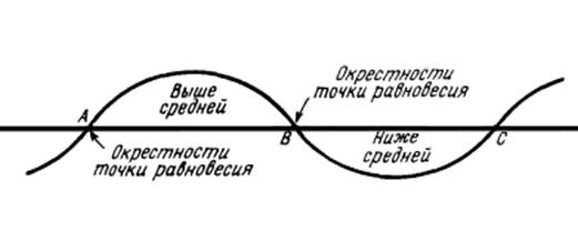 Другой экономист, Шумпетер, смотрит на структуру экономических циклов немного по-другому. Он считает, что критические точки следует искать не в вершинах и низинах цикла, а в точках перегиба (по его терминологии это «окрестности точки равновесия»). Модель цикла по Шумпетеру представлена на рисунке 1.5.