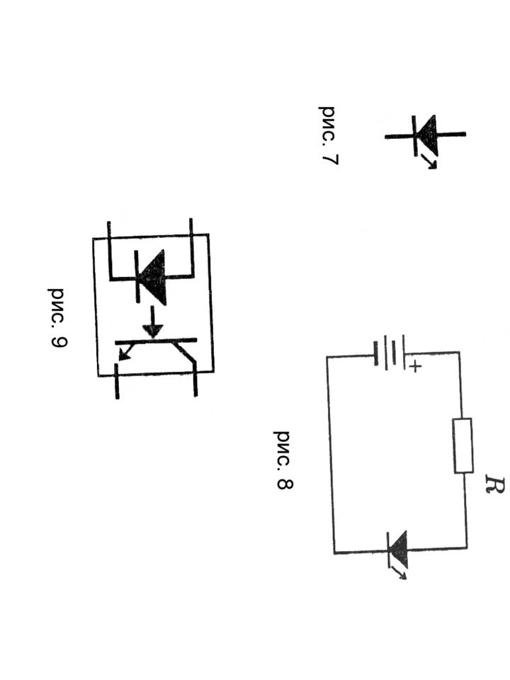 Схематическое обозначение светодиода показано на рис.7. На рис.8 изображена схема включения светодиода. Включенный последовательно резистор используется для ограничения прямого тока.