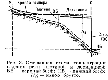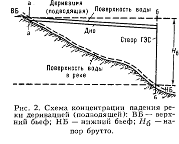 Напор ГЭС создается концентрацией падения реки на используемом участке плотиной(рис1), либо дерива