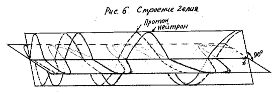 При образовании более тяжёлых атомов например гелия, вводится ещё одна плоскость пространства которая повёрнута относительно ,, основной,, на угол 90 градусов по одной из координат плоскости, при этом средняя плотность пространства одинакова для этих плоскостей. А угол сдвига при одинаковой частоте плотности пространства даёт сдвиг по расстоянию между нейтронами. Рис. 6.