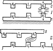 Перед запуском двигателя одноименные полюсы устанавливаются друг против друга . После начального толчка при включении батареи электромагнит N 1 будет отталкиваться от одноименного полюса N’1 и притягиваться полюсом S‘1 В результате такого взаимодействия полюс электромагнита N1 станет против полюса электромагнита S’1 и по инерции пройдет несколько дальше. В этот момент коммутатор (действие его будет рассмотрено позднее) произведет переключение полюсов батареи, и по обмотке электромагнитов подвижного диска будет проходить ток обратного направления. Вследствие этого полярность полюсов электромагнитов подвижного диска изменится и полюс N1, ставший теперь полюсом, одноименным с полюсом S’1 , будет от него отталкиваться. Аналогичный процесс будет происходить и при взаимодействии остальных полюсов электромагнитов, расположенных на подвижном диске и на неподвижной раме. Такое периодическое изменение полюсов электромагнитов в подвижном диске 8 раз за один оборот при наличии инерции будет поддерживать непрерывное вращение как подвижного диска, так и вмонтированного в его центр рабочего вала электродвигателя.