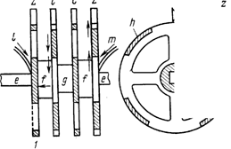 изолятора h. Поверхность колец была хорошо отполированной и ровной. По этой поверхности при вращении колец скользил контактный рычаг г, представлявший собой своеобразную щетку. Другой конец рычага опускался в чашечку со ртутью k, которая соединялась проводником с батареей. Металлические кольца были соединены с электромагнитами вращающегося диска. При его вращении металлические рычаги, попадая на непроводящие части колец, прерывали цепь, а при соприкосновении с металлом замыкали ее. Когда рычаг переходил с непроводящей части на металл, т. е. в тот момент, когда встречались разноименные полюсы, в обмотках электромагнитов, установленных на подвижном диске и последовательно соединенных, менялось направление тока.