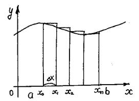 1). Разобьем отрезок [a;b] на n равных частей. Шаг разбиения Dx=(b–a)/n. При этом Sтр=lim(f(x0)Dx+f(x1)Dx+ .+f(xn))Dx= n®¥ = lim Dx(f(x0)+f(x1)+ .+f(xn)) При n®¥ получим, что Sтр= Dx(f(x0)+f(x1)+ .+f(xn)) |