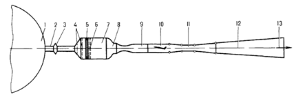 1 - баллон со сжатым воздухом 2 - трубопровод 3 - регулирующий дроссель 4 - выравнивающие сетки 5 - хонейкомб 6 - детурбулизирующие сетки 7 - форкамера 8 - конфузор 9 - сверхзвуковое сопло 10 - рабочая часть с моделью 11 - сверхзвуковой диффузор 12 - дозвуковой диффузор 13 - выброс в атмосферу