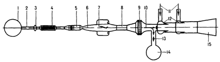 1 - баллон с высоким давлением 2 - трубопровод 3 - регулирующий дроссель 4 - подогреватель 5 - форкамера с хонейкомбом и сетками 6 - гиперзвуковое осесимметричное сопло 7 - рабочая часть с моделью 8 - гиперзвуковой осесимметричный диффузор 9 - воздухоохладитель 10 - направление потока 11 - подвод воздуха в эжекторы 12 - эжекторы 13 - затворы 14 - вакуумная емкость 15 - дозвуковой диффузор