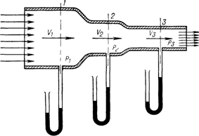 Для измерения давления в рассматриваемых сечениях используются манометры (см. следующий раздел), одна трубка которых соединена с атмосферой. Анализируя показания манометров (см. Рис.1.1), можно сделать заключение, что наименьшее статическое давление (по сравнению с атмосферным) показывает манометр в сечении 3-3.