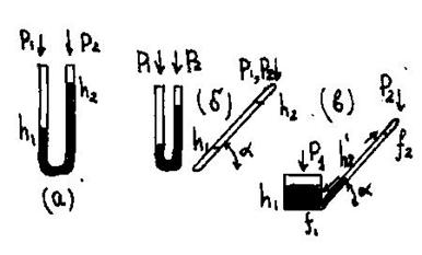 Если жидкость с удельным весом g = r∙g (где, r - ее плотность, а g – ускорение свободного падения) занимает положения h1 и h2 при давлениях в коленах p1 и р2 (Рис.1.2.,а), то