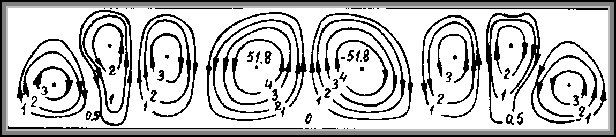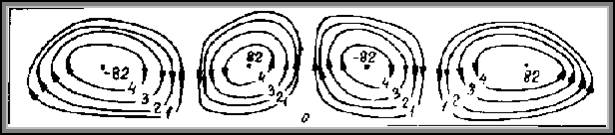 При Â > Âкр в жидкости возникает стационарное конвективное движение, периодическое в плоскости ху. Все пространство между плоскостями разделяются на прилегающие друг к другу одинаковые ячейки, в каждой из которых жидкость движется по замкнутым траекториям, не переходя из одной ячейки в другую. Контуры этих ячеек на граничных плоскостях образуют в них некоторую решетку. Значение kкр определяет периодичность, но не симметрию этой решетки; линеаризованные уравнения движения допускают в (3.3) любую функцию j(x, y), удовлетворяющую уравнению (D2 – k2)j = 0. Устранение этой неоднозначности в рамках линейной теории невозможно. По-видимому должна осуществляться «двухмерная» структура движения, в которой на плоскости ху имеется лишь одномерная периодичность – система параллельных полос.